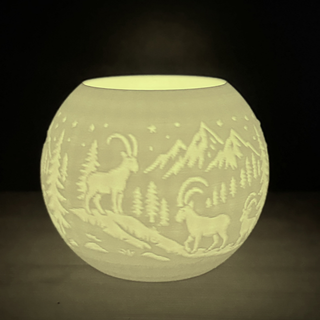 Die Lichtkugel zeigt ein detailreiches Schweizer Motiv, „Steinböcke“ in einem warmen Lichtspiel, sobald sie beleuchtet wird. Ich designe und fertige in der Schweiz unter Verwendung von PLA (Kunststoff auf Basis nachwachsender Rohstoffe).